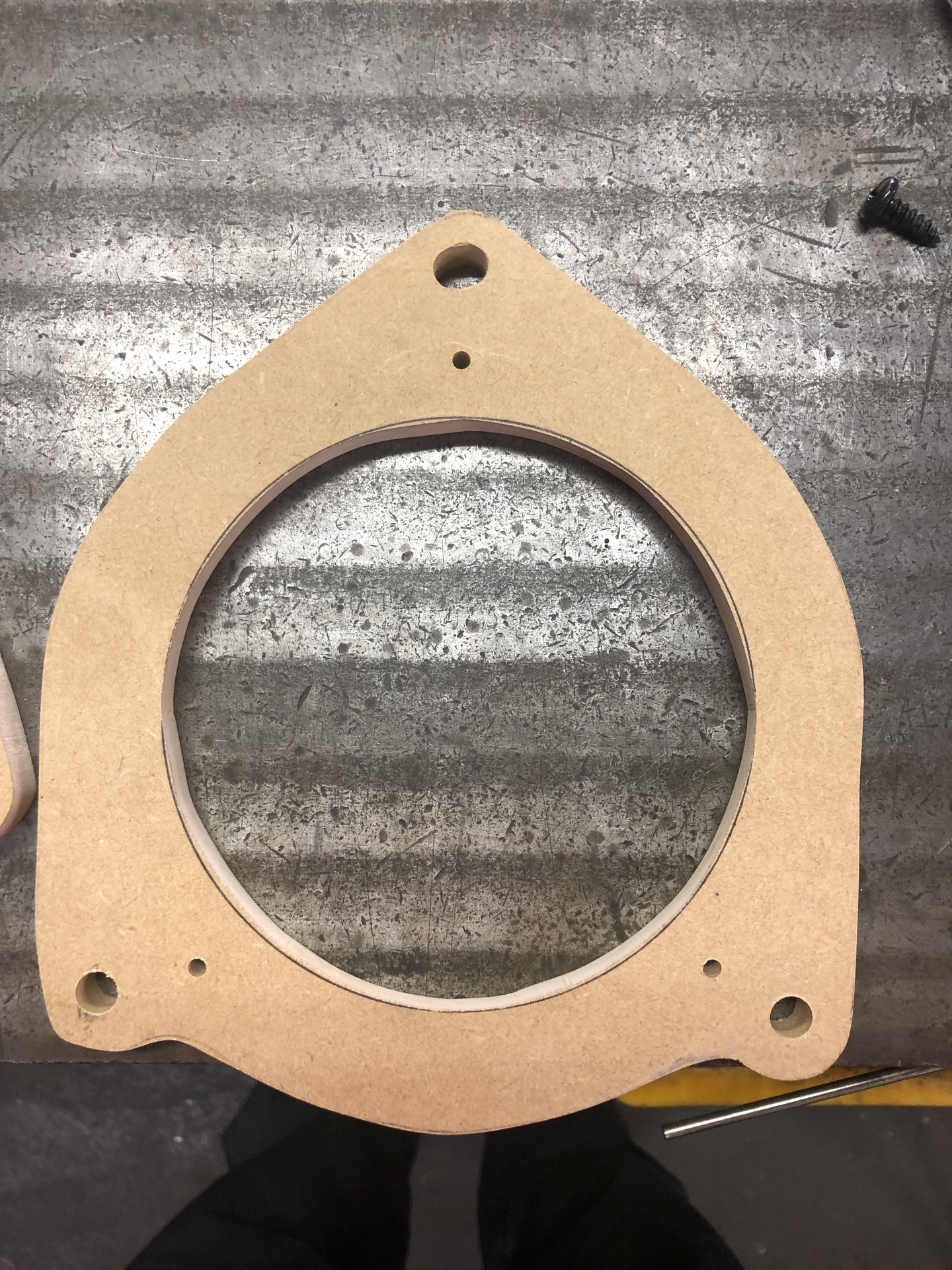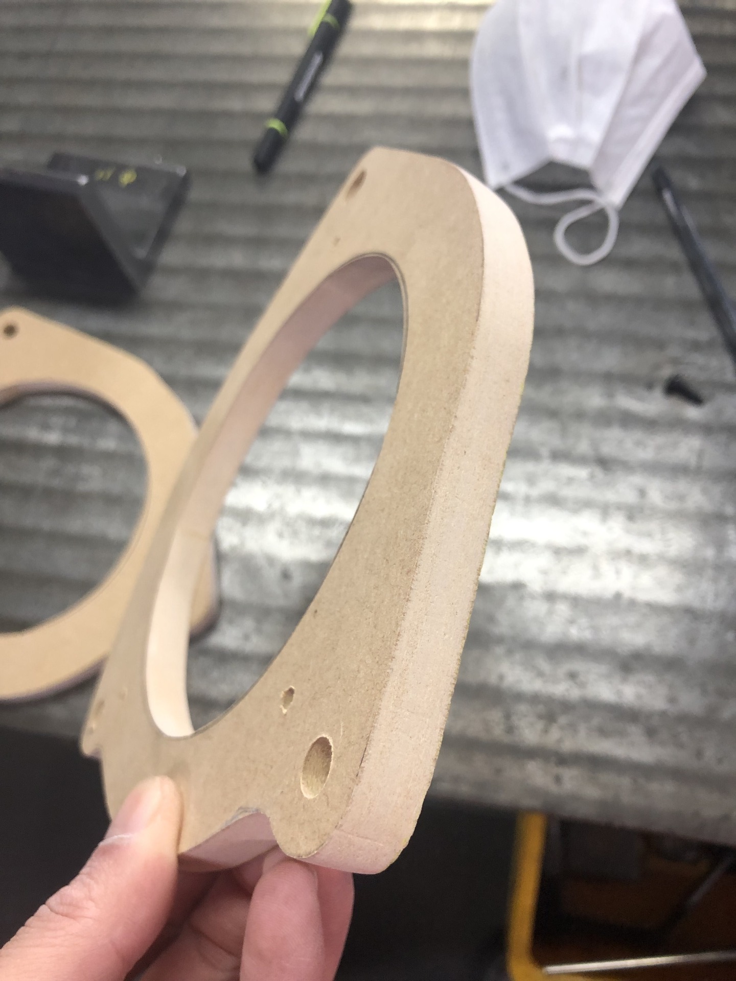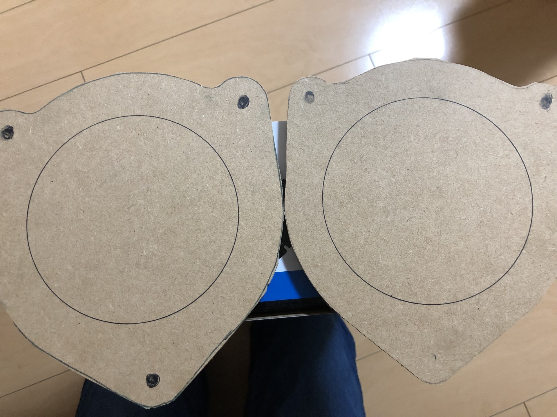外型とバッフルボードの固定穴は純正スピーカーからペンでざっくりとなぞって切り出しました