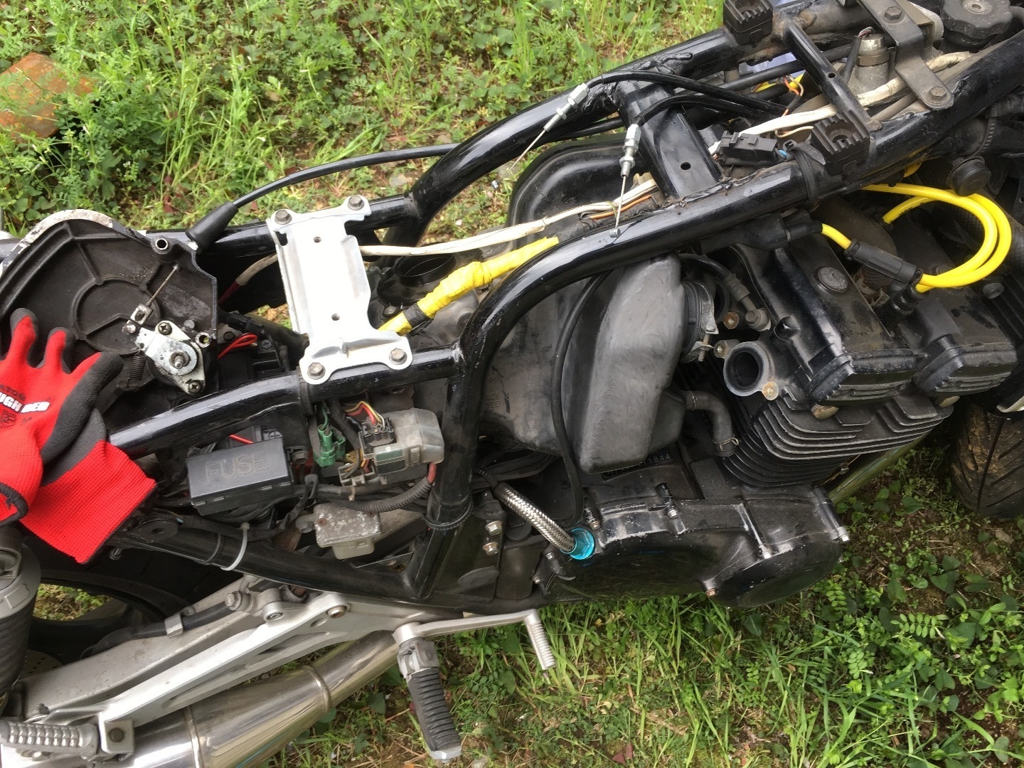 後は引っこ抜いて横から抜くだけです。文章にすると簡単ですけどホースバンドのボルトの向きとかによるとかなり苦労すると思います。あとケーブル類が…毎回毎回スロットルワイヤーには苦戦します。外すのは全然苦じゃないんですけど、取り付けるときは本当にイライラしながら作業やってますね。