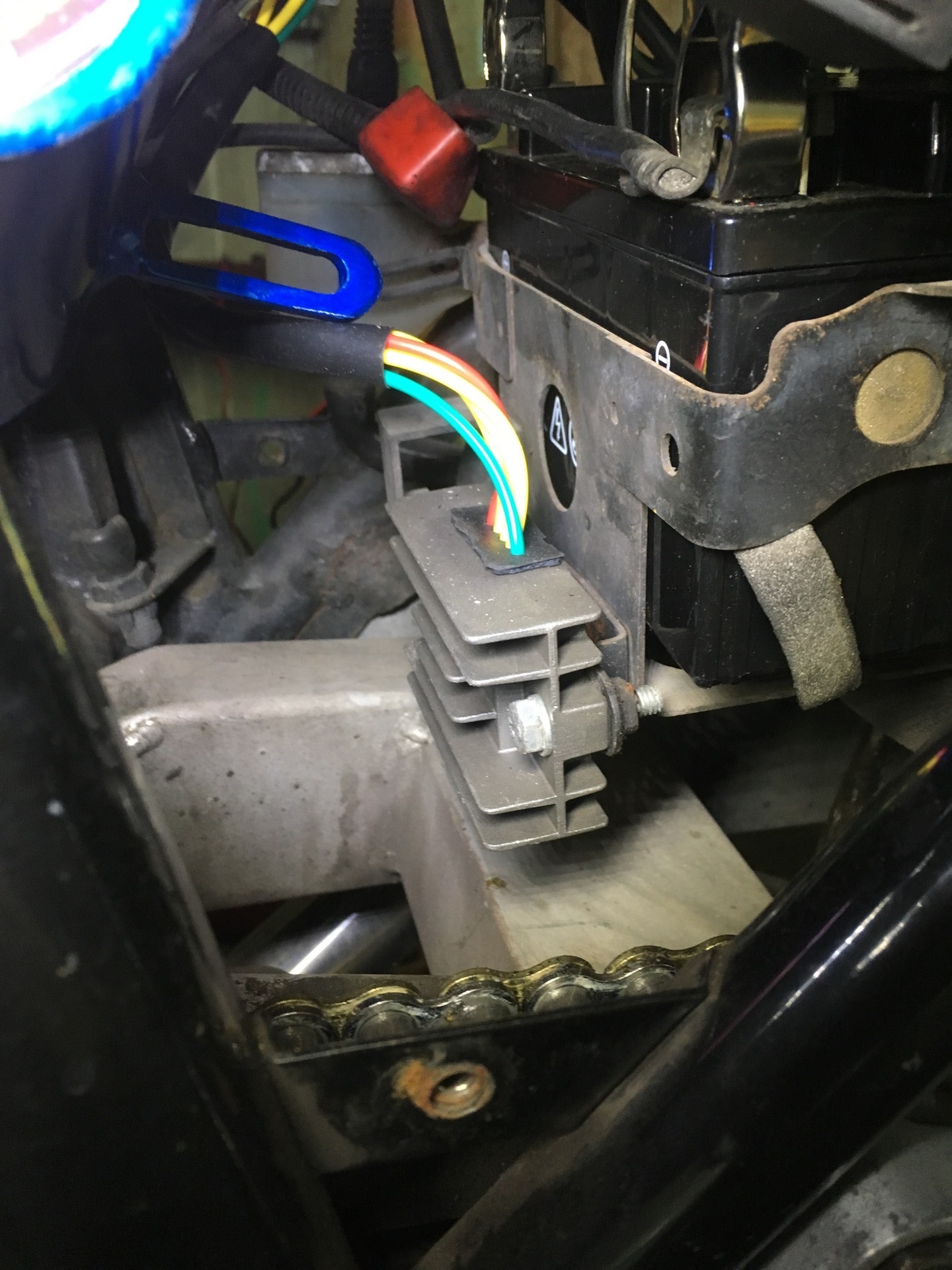 バッテリーの前についてます。てかバイクの部品って壊れやすい印象がありますが、こんな風にほぼ野ざらしな状態で電装品とかついてりゃそら壊れやすい云々より嫌でも壊れるよな。。とふと思いました。