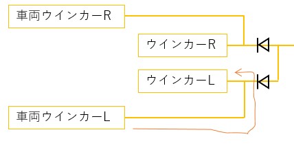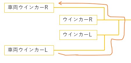 例を挙げると上のオレンジ線のように電気が流れると左ウインカーを上げようとすると右ウインカーも点滅してしまいます