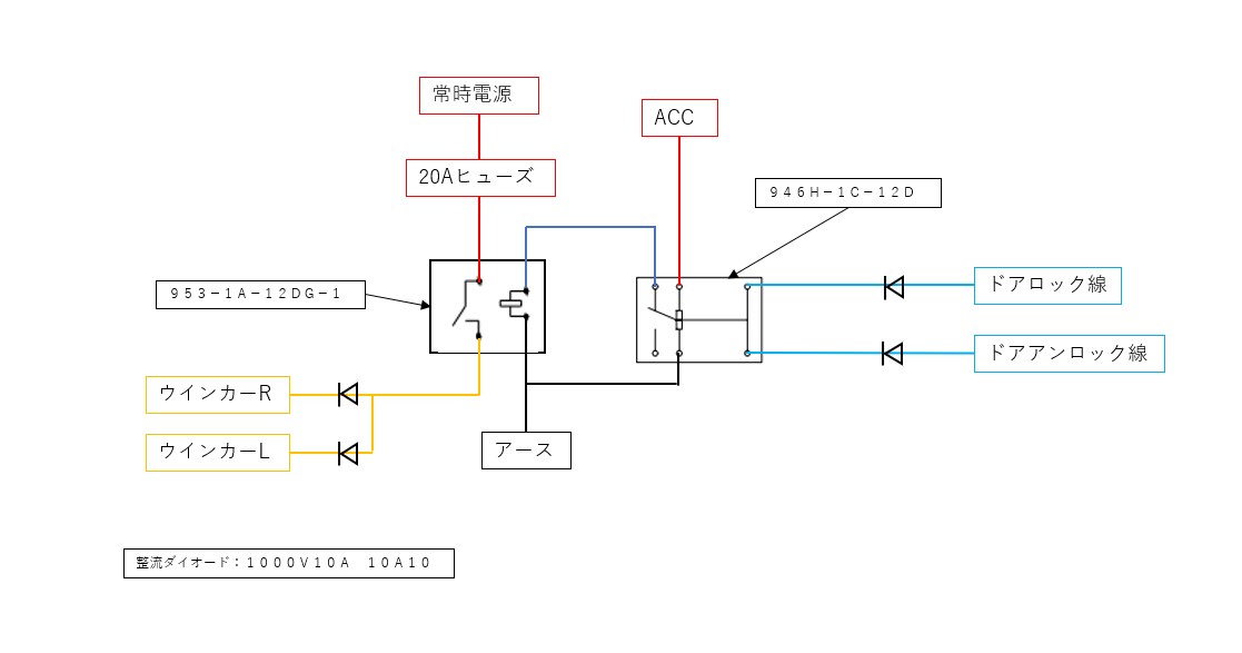 因みに参考にした回路のドアロック/アンロック信号に使用する整流ダイオードは1Aのタイプを使用するとありますが、1Aだと容量不足?なのか動作が不安定でしたので私は全ての箇所で10Aの整流ダイオードを使用しました
