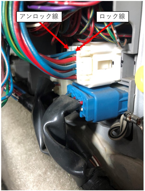 クオリスのドアロック/アンロック信号は運転席足元右側のパネルの裏にコネクターが大量にある中にありました