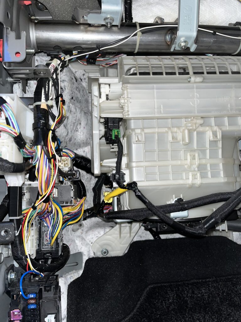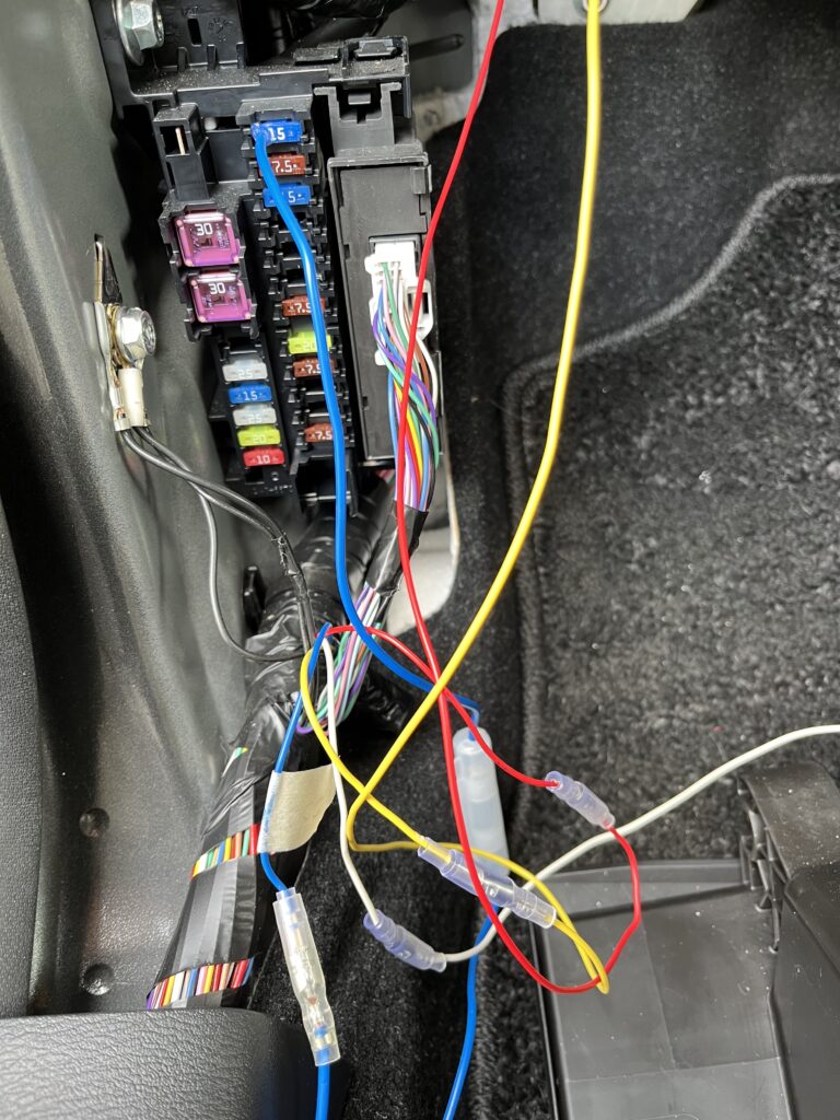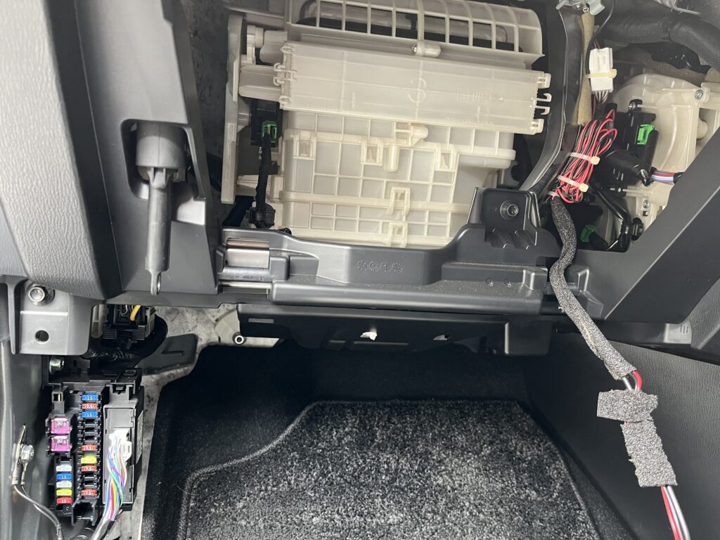 助手席足元左側にあるヒューズボックス付近から配線を取っていきます