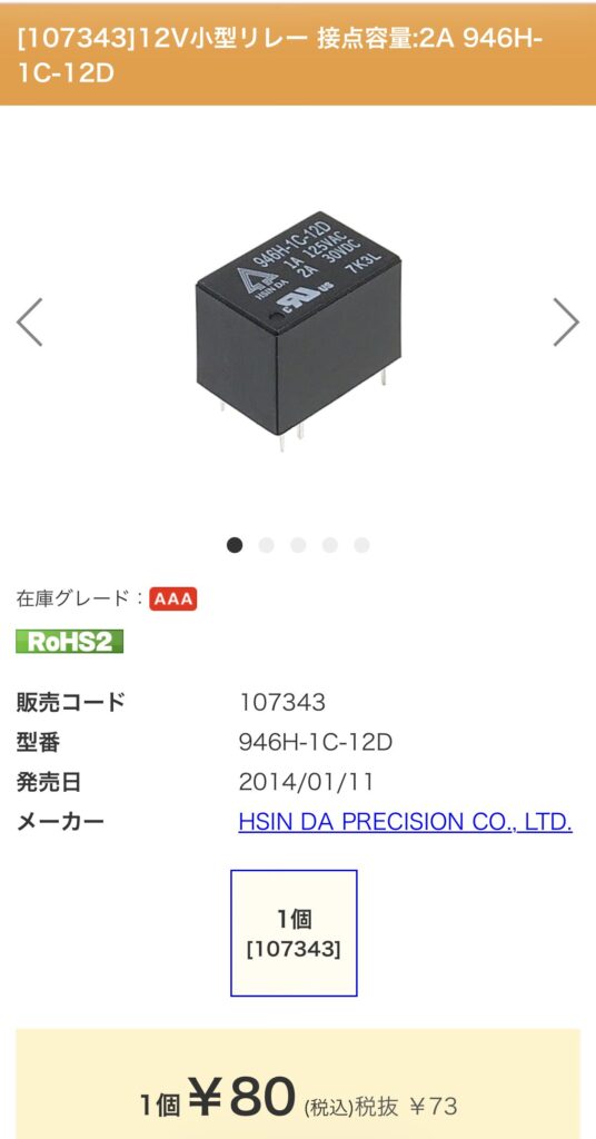まずはリレーを調達しますが、例の如く秋月電気通商から